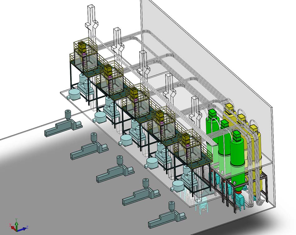 本產(chǎn)品為多種原料配方自動(dòng)計(jì)量磅秤,該上料輔機(jī)系統(tǒng)將原料區(qū)與生產(chǎn)區(qū)分離,采用真空吸引輸送技術(shù),幫助客戶(hù)降低設(shè)備及建筑成本,減少人工,并實(shí)現(xiàn)清潔生產(chǎn)。該系統(tǒng)采用中央控制體系,技術(shù)員可于中控箱的操作面板上直接控制、檢查全套設(shè)備的工作情況。